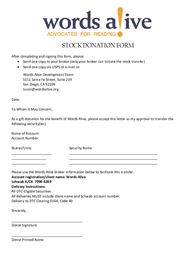 STOCK DONATION FORM After completing and signing this form, please: Send one copy to your broker (only your broker can initiate the stock transfer) Send one copy via USPS or email to: Words Alive
