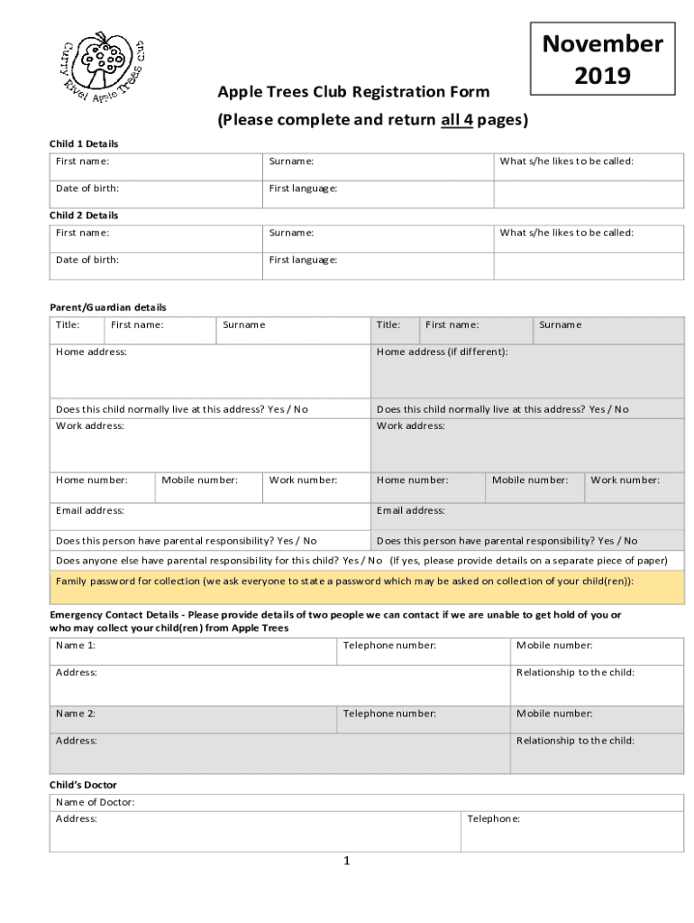 November 2019AppleTreesClubRegistrationForm (Pleasecompleteandreturnall4pages) Child1DetailsFirstname: Dateofbirth: Child2Details First name: Dateofbirth: Surname:What's/helices robocalled:First language:Surname:What's/helikestobecalled:First