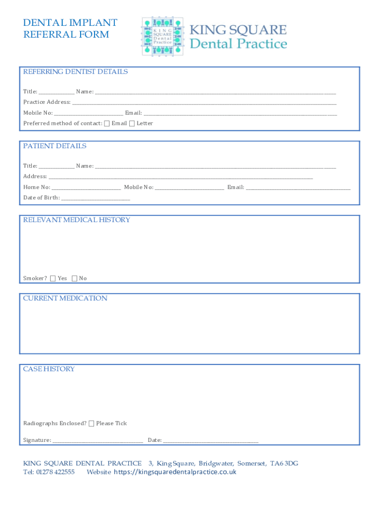 DENTAL IMPLANT REFERRAL FORMREFERRING DENTIST DETAILS Title: Name: Practice Address: Mobile No: Email: Preferred method of contact: Email LetterPATIENT DETAILS Title: Name: Address: Home No: Mobile