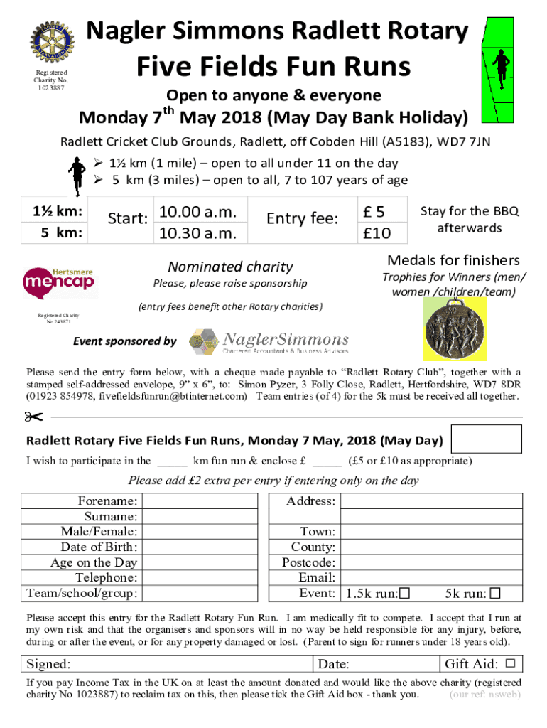 Nagger Simmons Hallett RotaryFive Fields Fun Unregistered Charity No. 1023887Open to anyone & everyonethMonday 7 May 2018 (May Day Bank Holiday) Hallett Cricket Club Grounds, Hallett, off Cob den