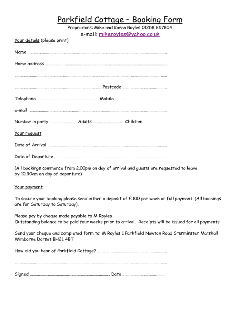 Park field Cottage Booking Form Proprietors: Mike and Karen Roles 01258 857804Your details (please print)email: mikeroyles yahoo.co.name. Home address.