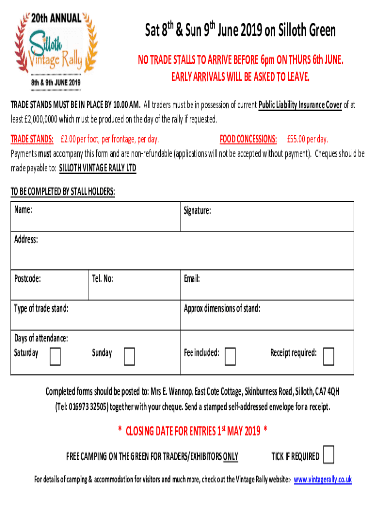 Sat 8th & Sun 9th June 2019 on Sloth Green NO TRADE STALLS TO ARRIVE BEFORE 6pm ON THURS 6th JUNE. EARLY ARRIVALS WILL BE ASKED TO LEAVE. TRADE STANDS MUST BE IN PLACE BY 10.00 AM. All traders must