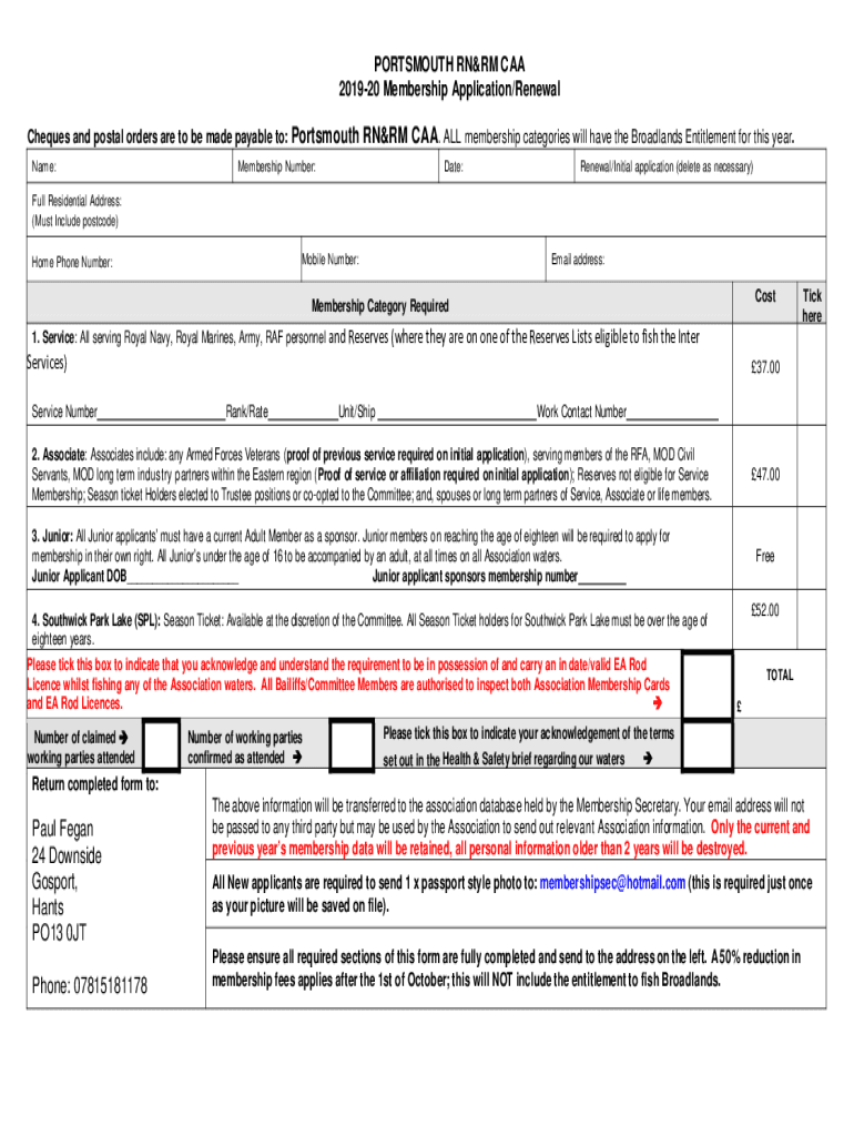 PORTSMOUTH NORM CAA 201920 Membership Application/Renewal Checks and postal orders are to be made payable to: Name:Portsmouth NORM CAA. ALL membership categories will have the Broad lands Entitlement