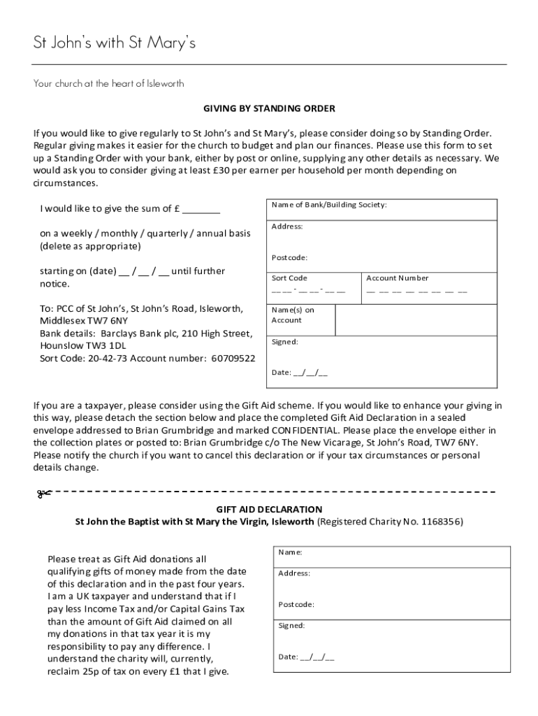 Your church at the heart of IsleworthGIVING BY STANDING Order you would like to give regularly to St Johns and St Mary's, please consider doing so by Standing Order. Regular giving makes it easier for the church to budget and plan our finances. Please use this form to set