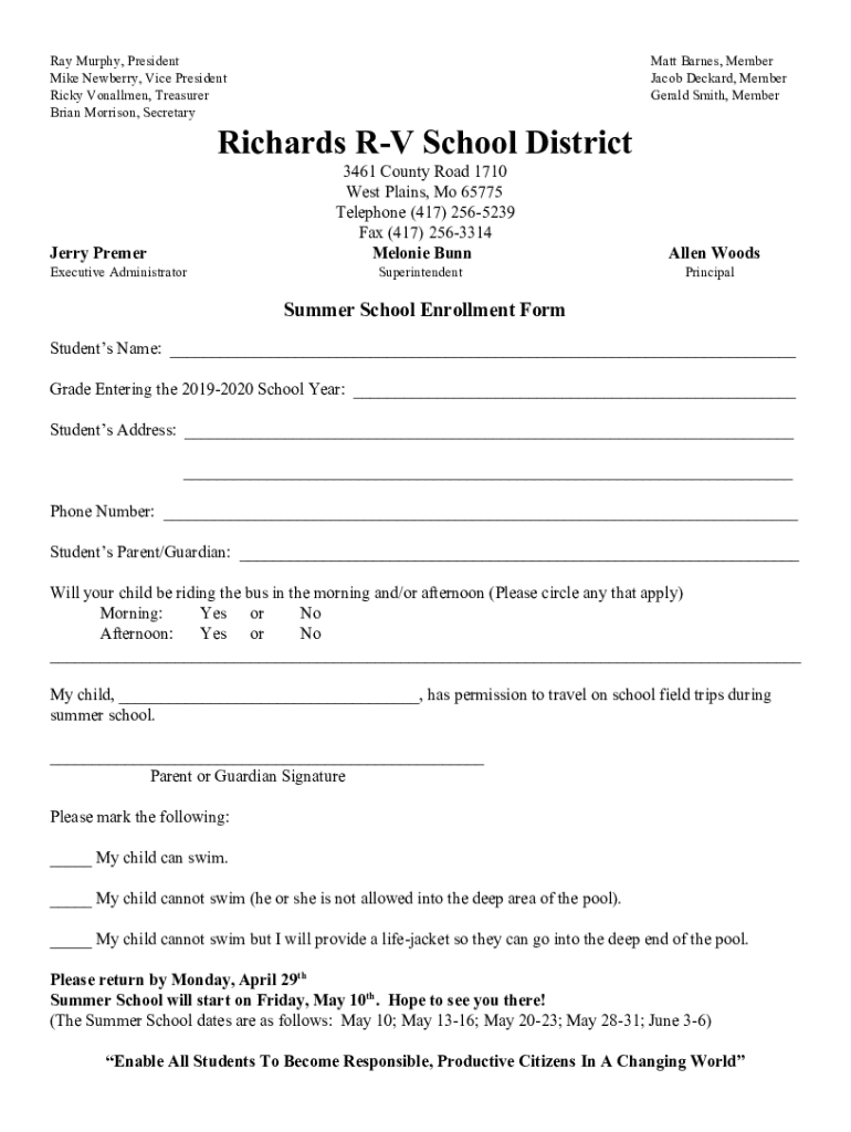 Ray Murphy, President Mike Newberry, Vice President Ricky Vonallmen, Treasurer Brian Morrison, Secretary Matt Barnes, Member Jacob Declared, Member Gerald Smith, Member Richards RV School District