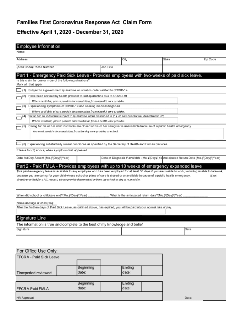 Families First Coronavirus Response Act Claim Form Effective April 1, 2020, December 31, 2020, Employee InformationNameAddressCity(Area Code) Phone NumberStateZip Code Job Teleport 1 Emergency Paid