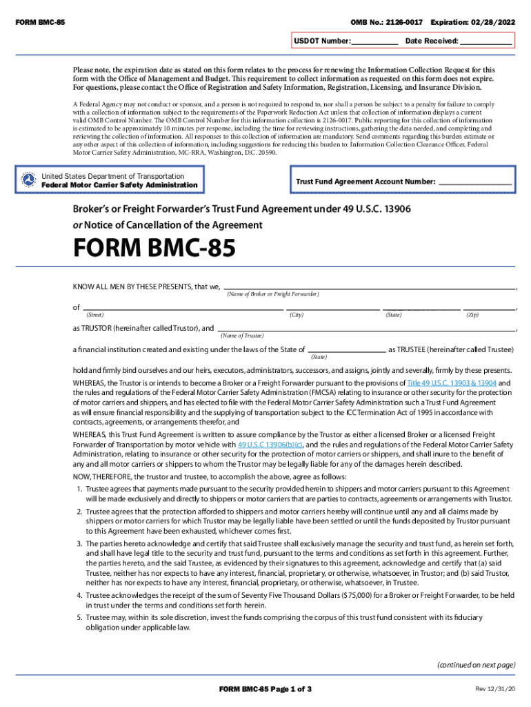 FORM BMC85OMB No.: 21260017 Expiration: 02/28/2022USDOT Number:Date Received:Please note, the expiration date as stated on this form relates to the process for renewing the Information Collection
