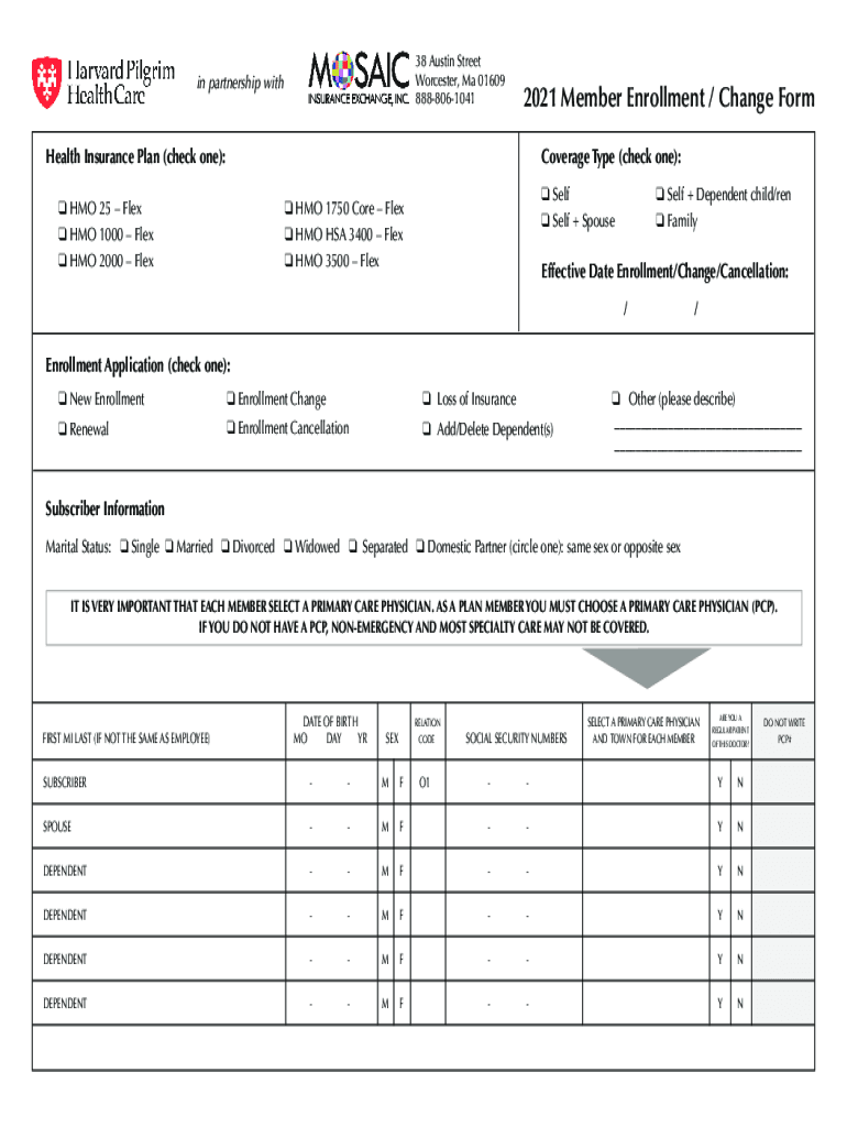 38 Austin Street Worcester, Ma 01609 8888061041in partnership with2021 Member Enrollment / Change FormHealth Insurance Plan (check one):Coverage Type (check one): HMO 25 Flex HMO 1000 Flex HMO 2000