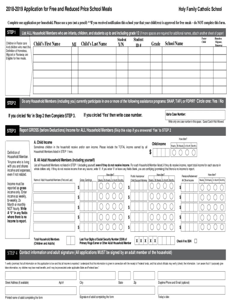 Holy Family Catholic School20182019 Application for Free and Reduced Price School MealsComplete one application per household. Please use a pen (not a pencil) **If you received notification this school
