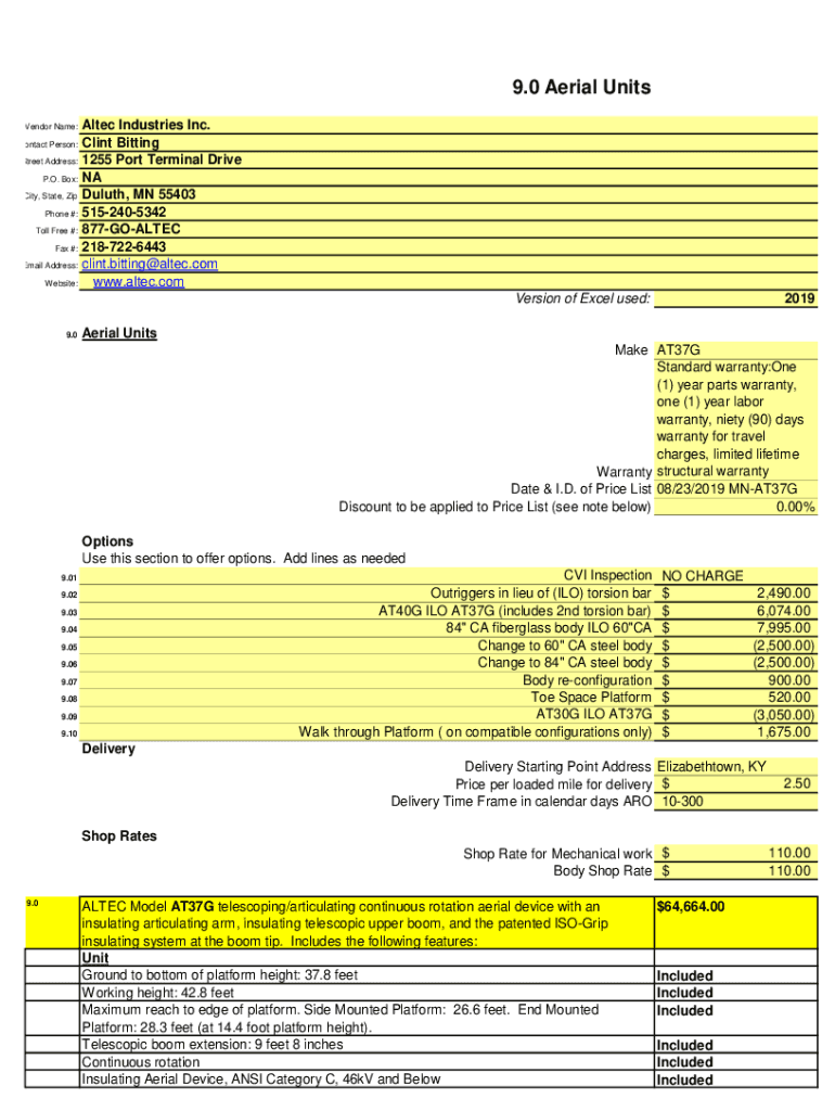 9.0 Aerial Units Vendor Name: contact Person: Street Address: P.O. Box: City, State, Zip Phone #: Toll Free #: Fax #: Email Address: Website:Alter Industries Inc. Clint Batting 1255 Port Terminal