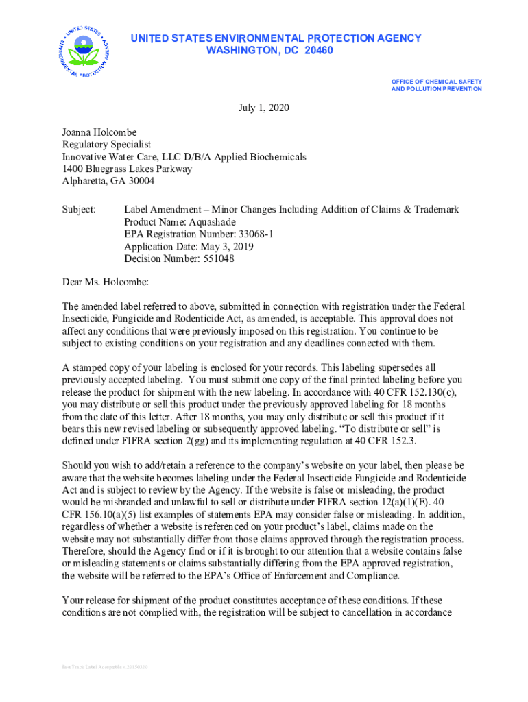 UNITED STATES ENVIRONMENTAL PROTECTION AGENCY WASHINGTON, DC 20460 OFFICE OF CHEMICAL SAFETY AND POLLUTION PREVENTION July 1, 2020, Joanna Holcombe Regulatory Specialist Innovative Water Care, LLC