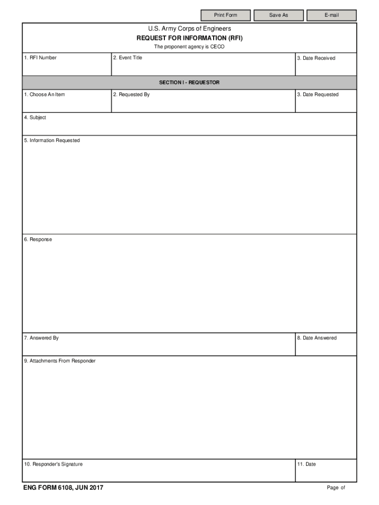 Print Form Save Email. S. Army Corps of Engineers REQUEST FOR INFORMATION (RFI) The proponent agency is ECO 1. RFI Number2. Event Title3. Date ReceivedSECTION I REQUESTOR 1. Choose An Item2. Requested