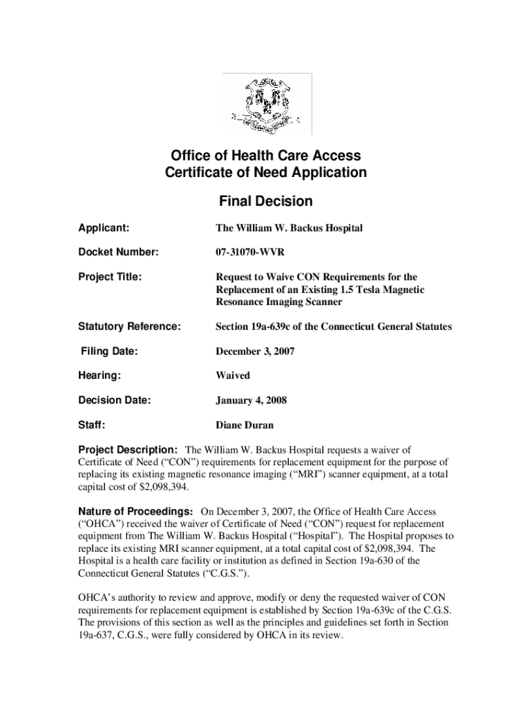 Applicant:The William W. Backus HospitalDocket Number:0731070WVRProject Title:Request to Waive CON Requirements for the