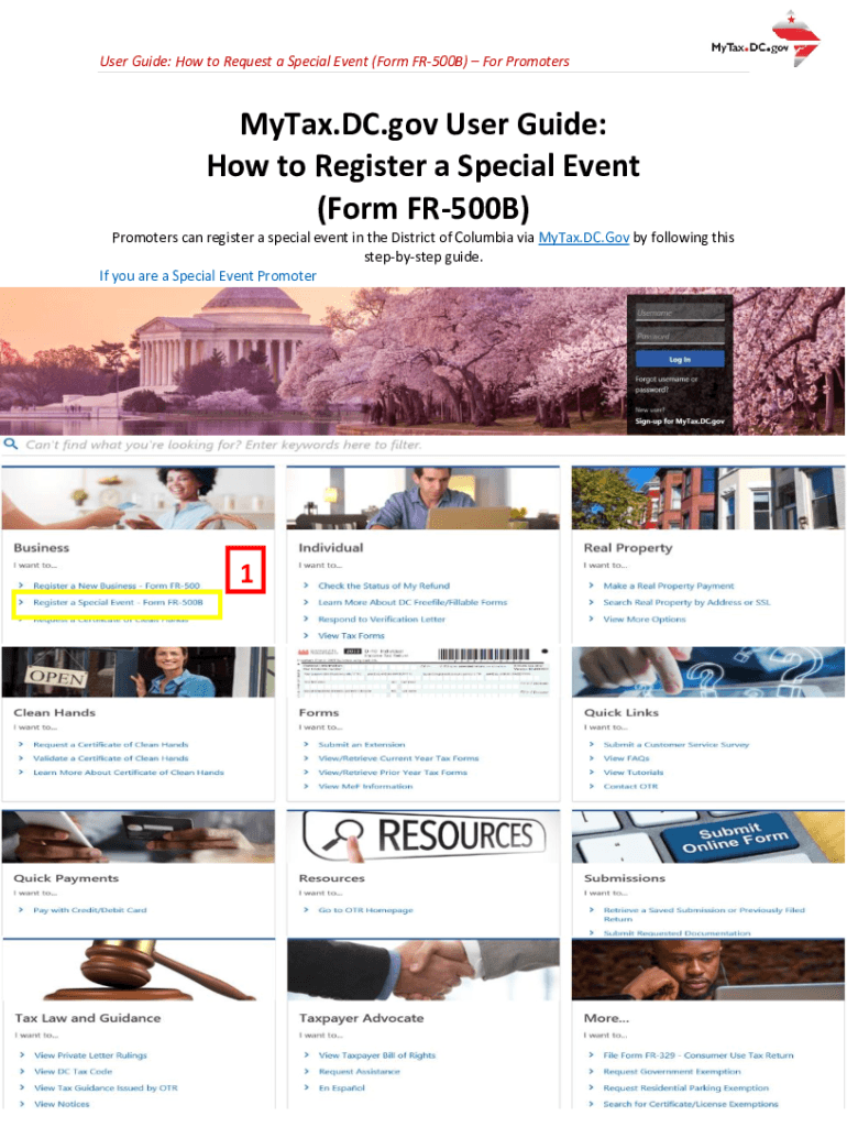 User Guide: How to Request a Special Event (Form FR500B) For PromotersMyTax.DC.gov User Guide: How to Register a Special Event (Form FR500B) Promoters can register a special event in the District