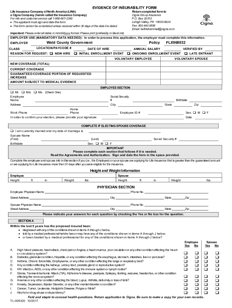 EVIDENCE OF INSURABILITY FORM Life Insurance Company of North America (LINA) a Cagney Company (herein called the Insurance Company) For info and customer service call 18666072360 The applicant must