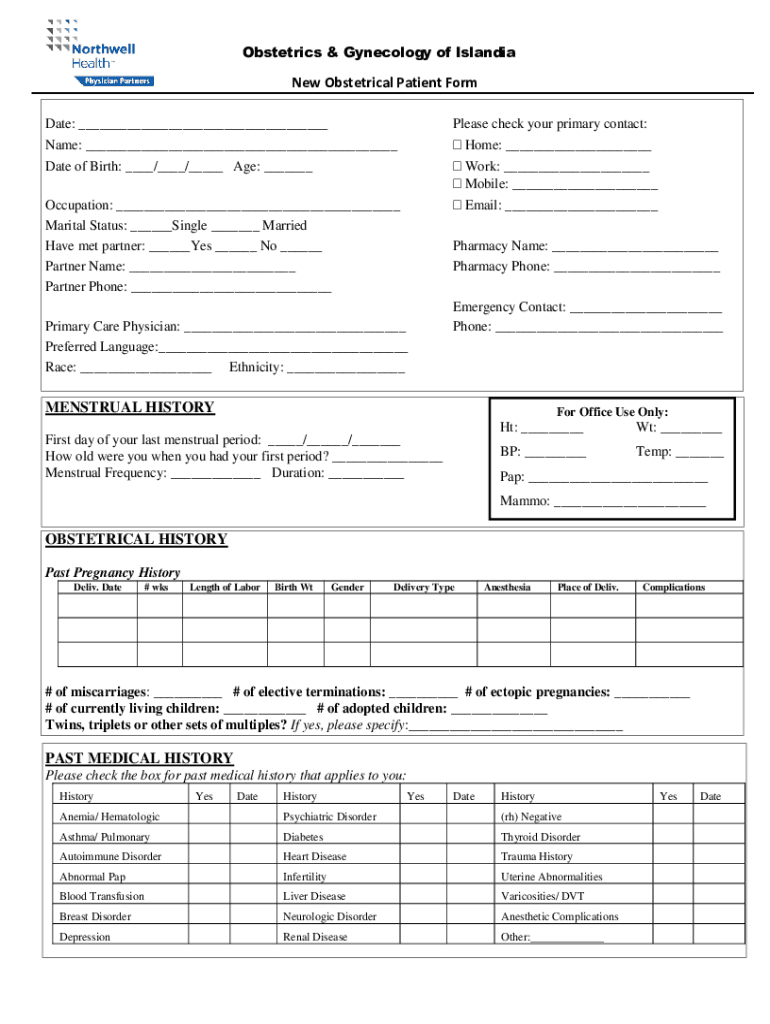Obstetrics & Gynecology of IslandiaNew Obstetrical Patient Form Date: Name: Date of Birth: / / Age: Please check your primary contact: Home: Work: Mobile: Occupation: Marital Status: Single Married