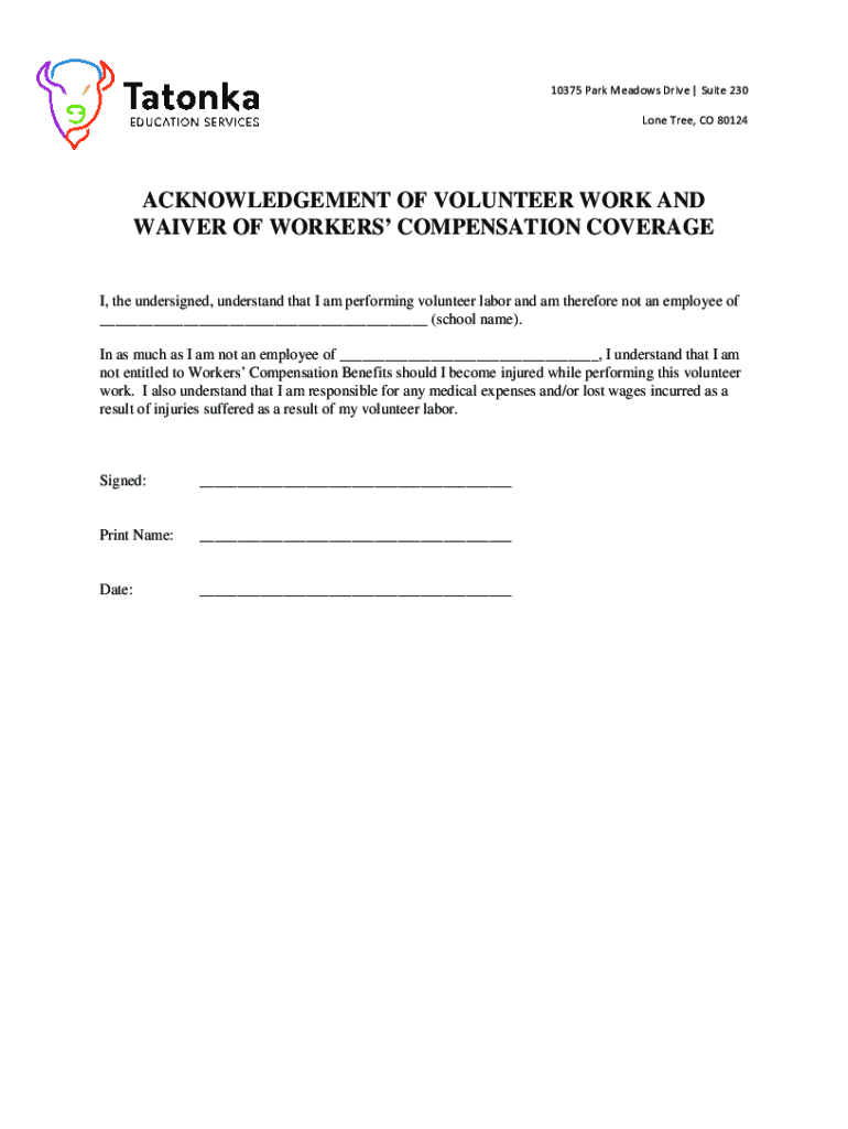 10375 Park Meadows Drive Suite 230 Lone Tree, CO 80124ACKNOWLEDGEMENT OF VOLUNTEER WORK AND WAIVER OF WORKERS COMPENSATION COVERAGE I, the undersigned, understand that I am performing volunteer labor