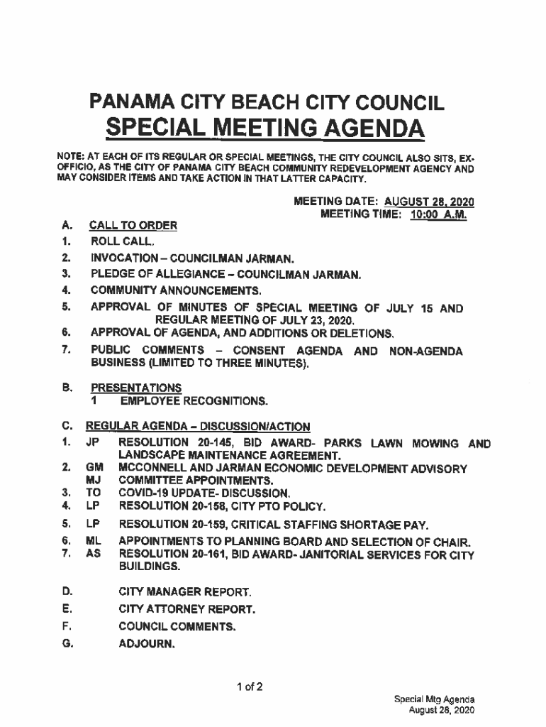 PANAMA CITY BEACH CITY COUNCILSPECIAL MEETING AGENDA NOTE: AT EACH OF ITS REGULAR OR SPECIAL MEETINGS, THE CITY COUNCIL ALSO SITS, EX OFFICIO, AS THE CITY OF PANAMA CITY BEACH COMMUNITY REDEVELOPMENT