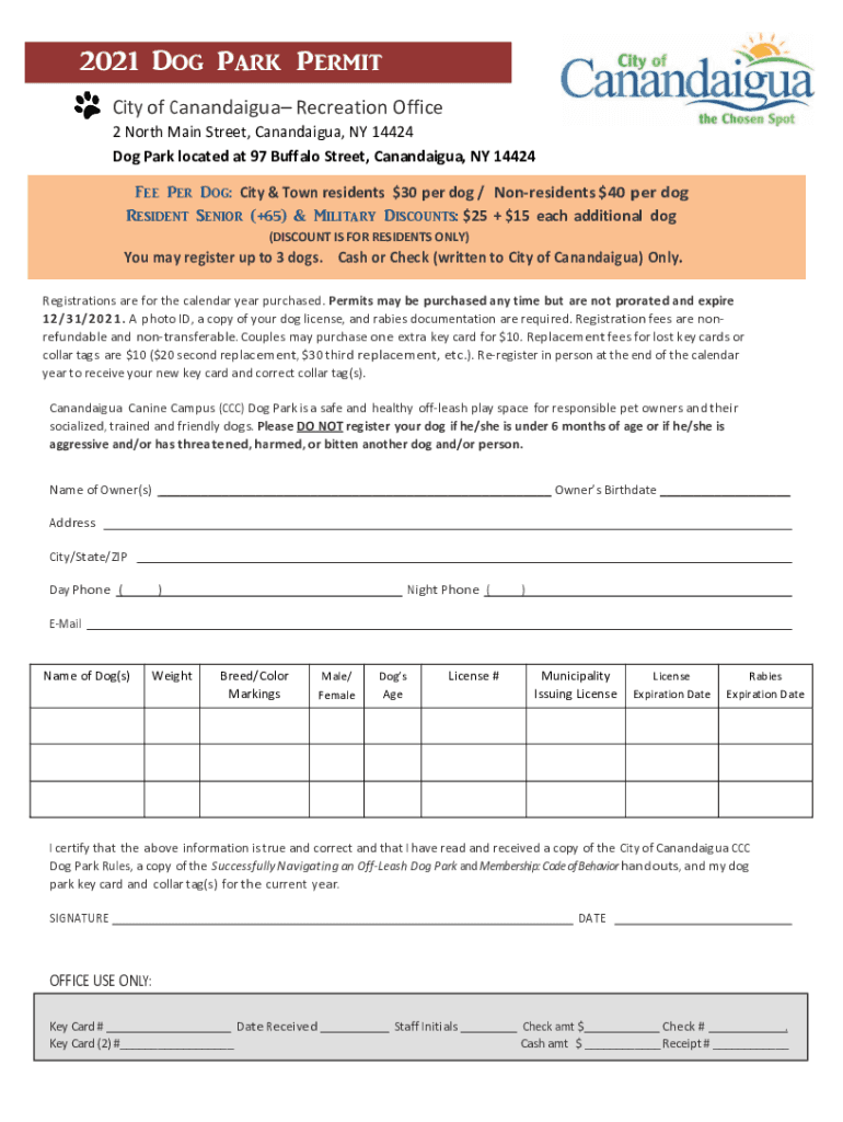 2021 Dog Park Permit City of Canandaigua Recreation Office 2 North Main Street, Canandaigua, NY 14424 Dog Park located at 97 Buffalo Street, Canandaigua, NY 14424 Fee Per Dog: City & Town residents