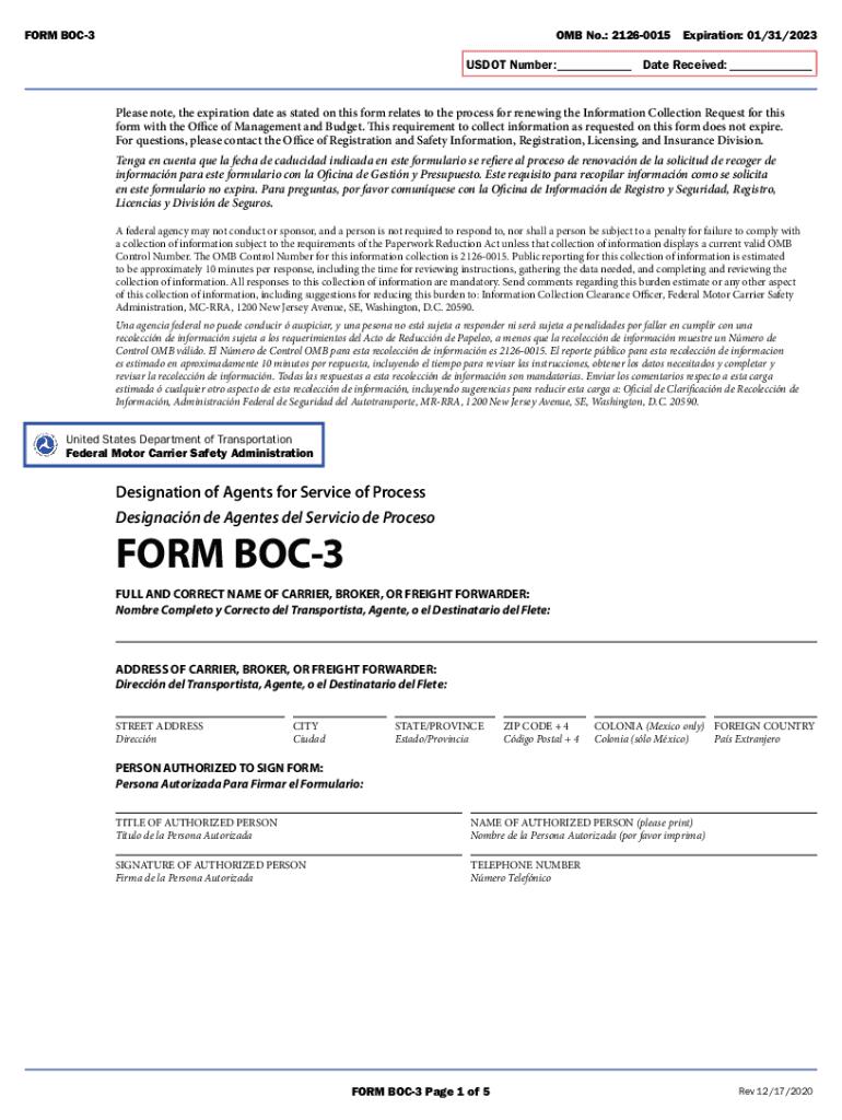 FORM BOC3OMB No.: 21260015 Expiration: 01/31/2023USDOT Number:Date Received:Please note, the expiration date as stated on this form relates to the process for renewing the Information Collection Request