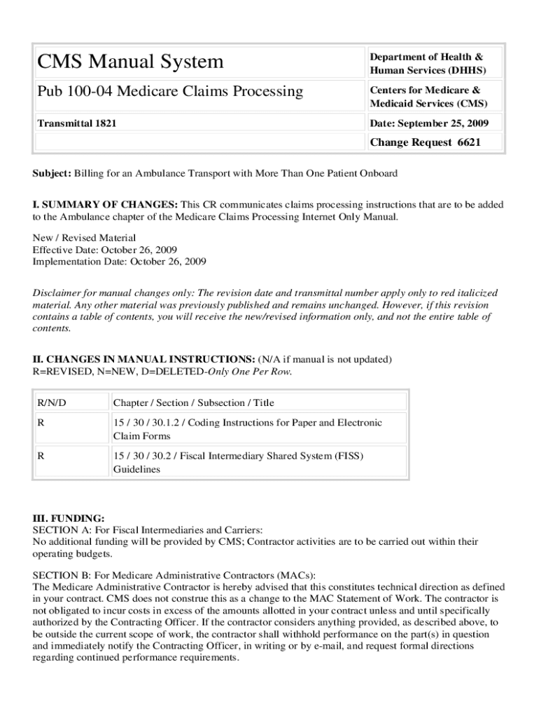 CMS Manual SystemDepartment of Health & Human Services (HHS)Pub 10004 Medicare Claims ProcessingCenters for Medicare & Medicaid Services (CMS)Transmittal 1821Date: September 25, 2009Change Request