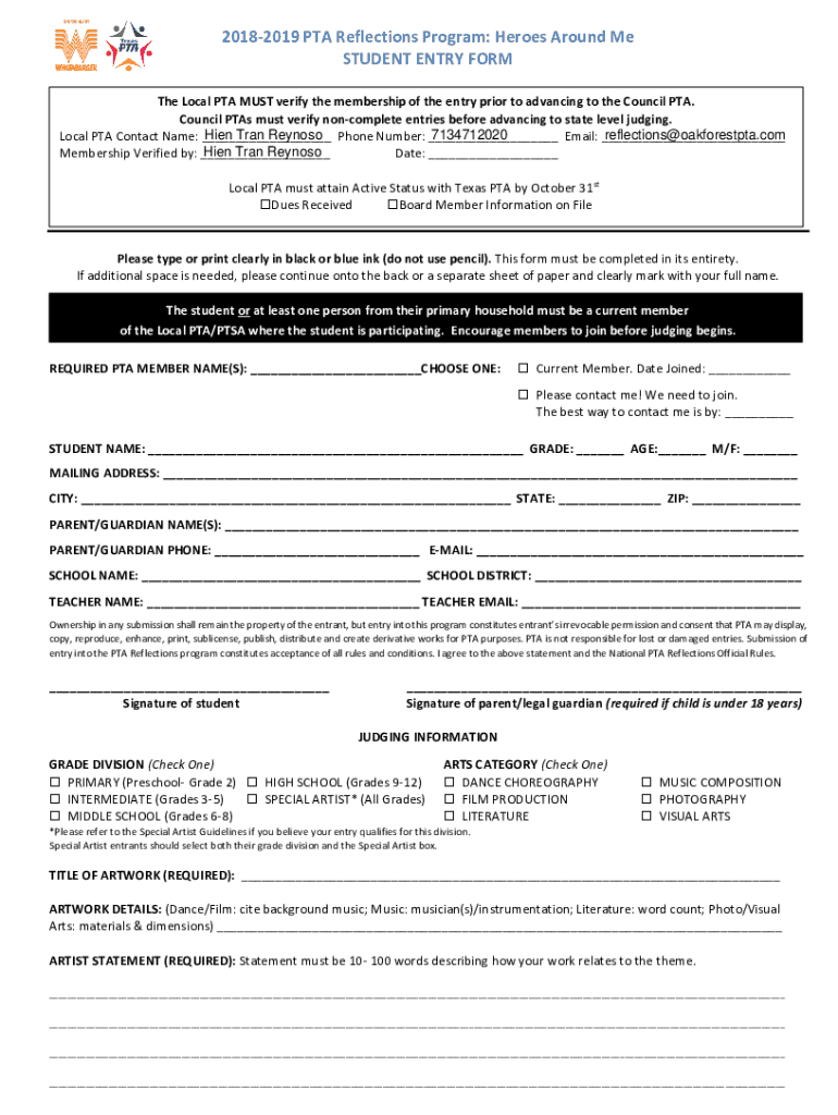 20182019 PTA Reflections Program: Heroes Around Me STUDENT ENTRY From The Local PTA MUST verify the membership of the entry prior to advancing to the Council PTA. Council PTA's must verify noncomplete