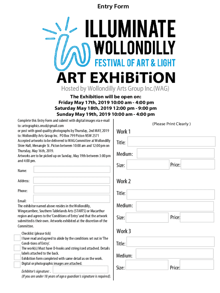 Entry Format Exhibition Hosted by Wollondilly Arts Group Inc.(WAG) The Exhibition will be open on: Friday, May 17th, 2019 10:00 am 4:00 pm Saturday, May 18th, 2019 12:00 pm 9:00 pm Sunday, May 19th,