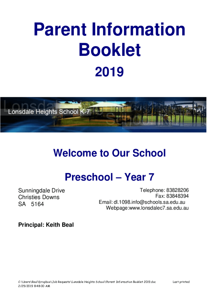 Parent Information Booklet 2019Welcome to Our School Preschool Year 7 Sunning dale Drive Christie's Downs SA 5164Telephone: 83828206 Fax: 83848394 Email: DL.1098.info schools.SA.edu.AU Webpage:www.lonsdalec7.sa.edu.auPrincipal: