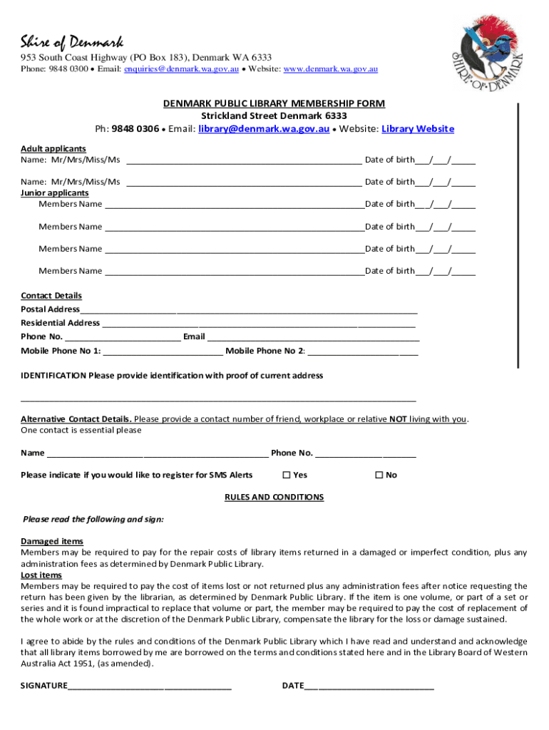 Shire of Denmark 953 South Coast Highway (PO Box 183), Denmark WA 6333 Phone: 9848 0300 Email: inquiries Denmark.Wei.gov.AU Website: www.denmark.wa.gov.auDENMARK PUBLIC LIBRARY MEMBERSHIP FORM Strickland