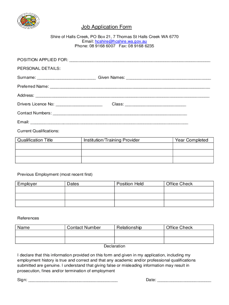 Job Application Form Shire of Halls Creek, PO Box 21, 7 Thomas St Halls Creek WA 6770 Email: Cheshire.Wei.gov.AU Phone: 08 9168 6007 Fax: 08 9168 6235POSITION APPLIED FOR: PERSONAL DETAILS: Surname: