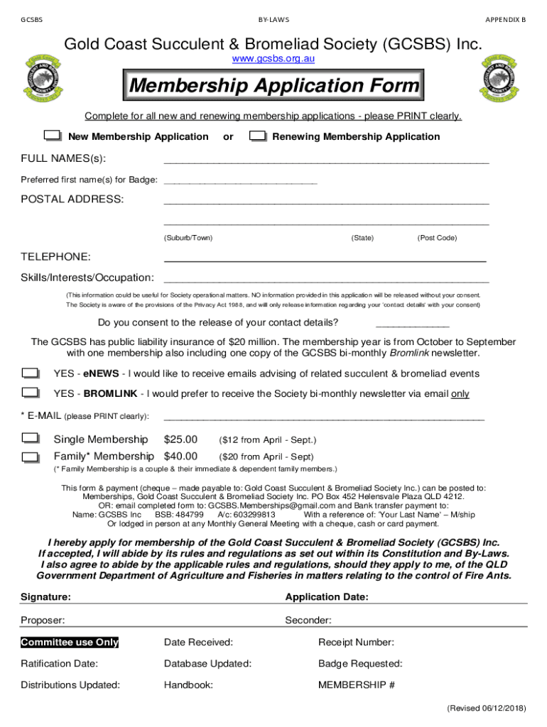 GCSBSBYLAWSAPPENDIX Gold Coast Succulent & Bromeliad Society (GCS BS) Inc. www.gcsbs.org.auMembership Application Form Complete for all new and renewing membership applications please PRINT clearly.