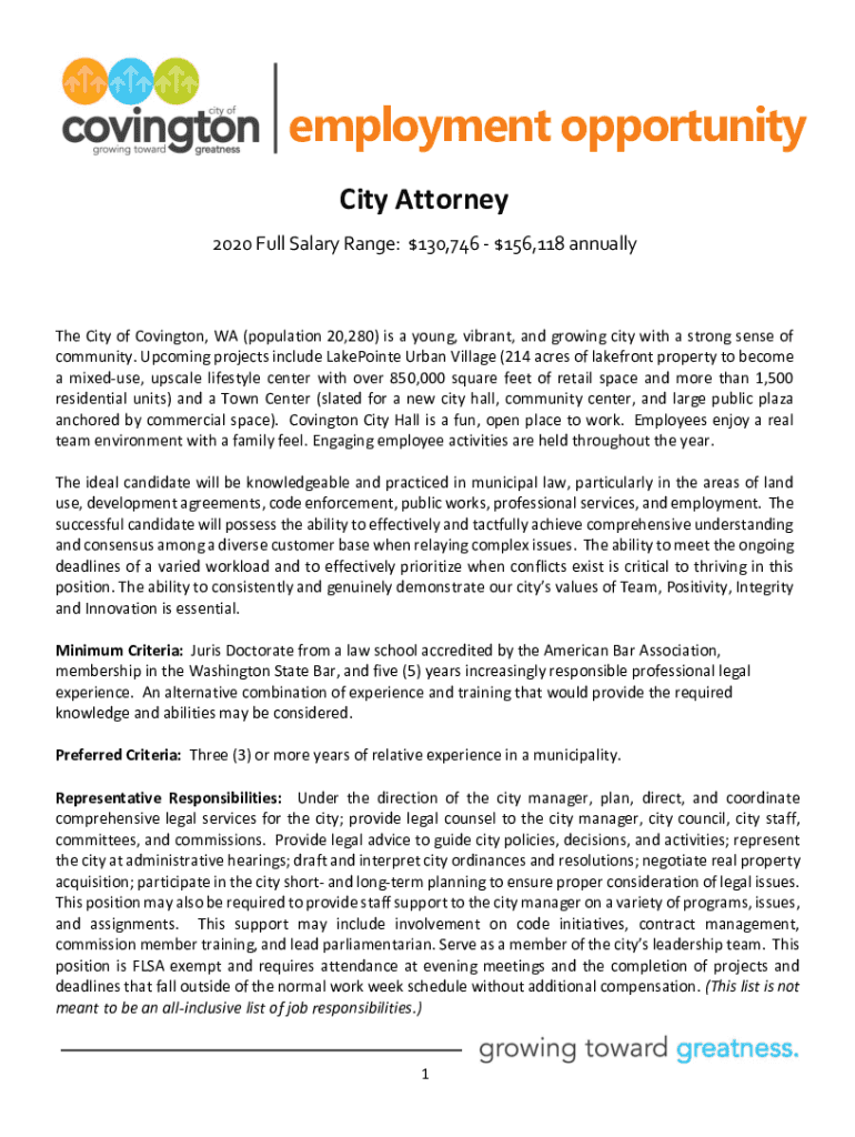 Employment opportunity City Attorney 2020 Full Salary Range: $$130,746156,118 annually City of Covington, WA (population 20,280) is a young, vibrant, and growing city with a strong sense of community.