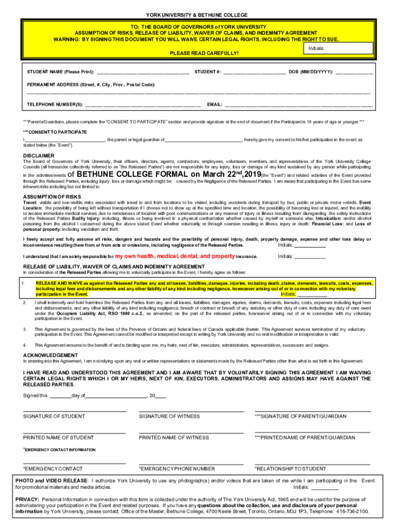 YORK UNIVERSITY & BETHUNE COLLEGE TO: THE BOARD OF GOVERNORS of YORK UNIVERSITY ASSUMPTION OF RISKS, RELEASE OF LIABILITY, WAIVER OF CLAIMS, AND INDEMNITY AGREEMENT WARNING: BY SIGNING THIS DOCUMENT
