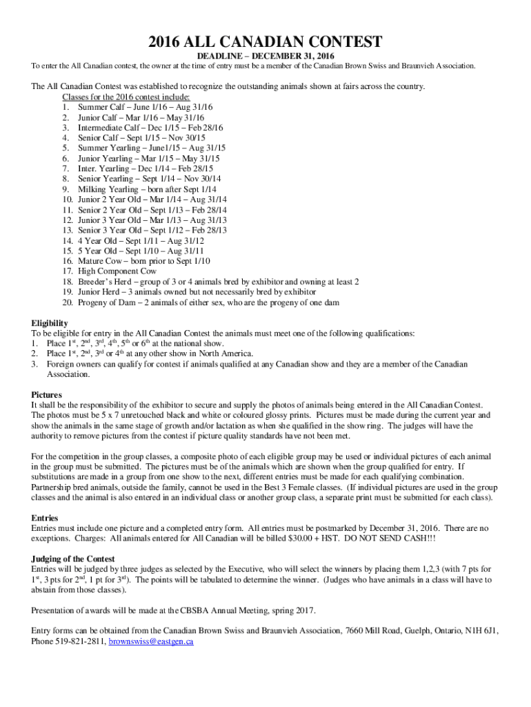 2016 ALL CANADIAN CONTEST DEADLINE DECEMBER 31, 2016, To enter the All Canadian contest, the owner at the time of entry must be a member of the Canadian Brown Swiss and Brandies Association. The Canadian