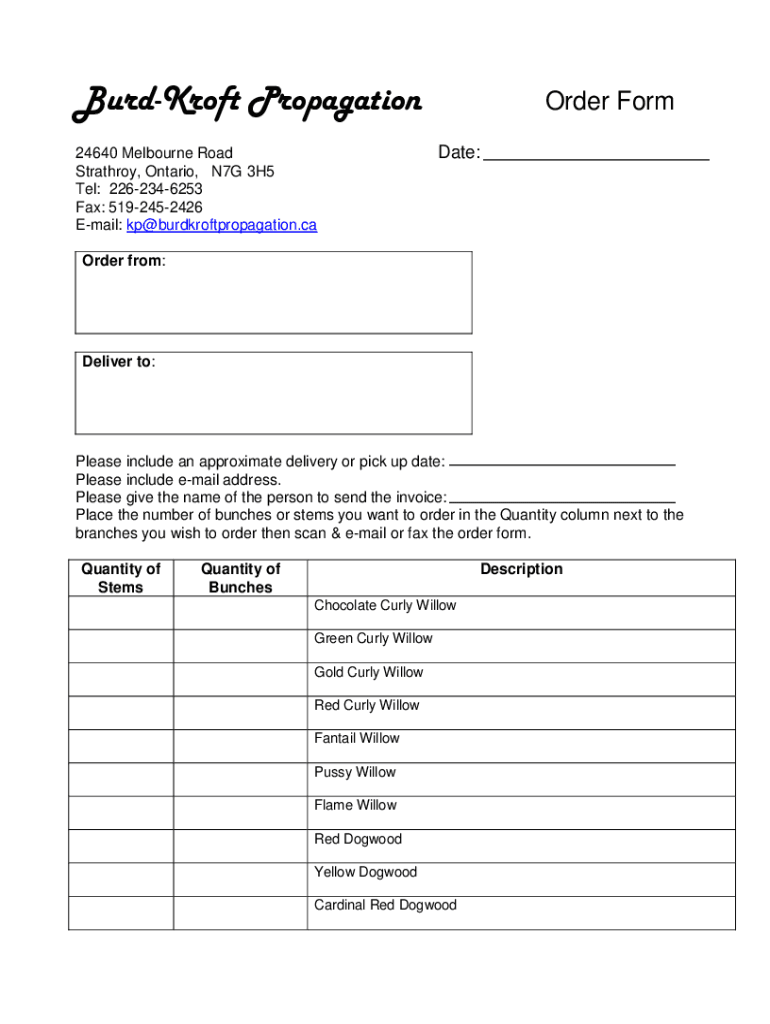 BurdKroft Propagation 24640 Melbourne Road Strategy, Ontario, N7G 3H5 Tel: 2262346253 Fax: 5192452426 Email: KP burdkroftpropagation. Carder Form Date:Order from:Deliver to:Please include an approximate