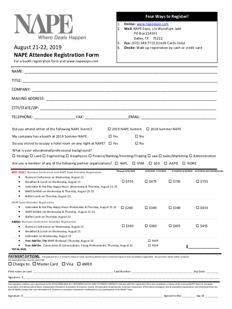 Four Ways to Register! 1. 2.3. 4. August 2122, 2019 NAPE Attendee Registration Formalize: www.napeexpo.com Mail: NAPE Expo, c/o Wyndham Jade PO Box 224531 Dallas, TX 75222 Fax: (972) 3497715 (Credit