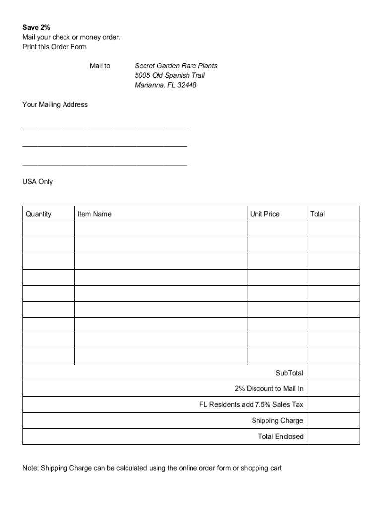 Save 2% Mail your check or money order. Print this Order Form Mail secret Garden Rare Plants 5005 Old Spanish Trail Marianna, FL 32448Your Mailing Address USA OnlyQuantityItem Amount PriceSubTotal