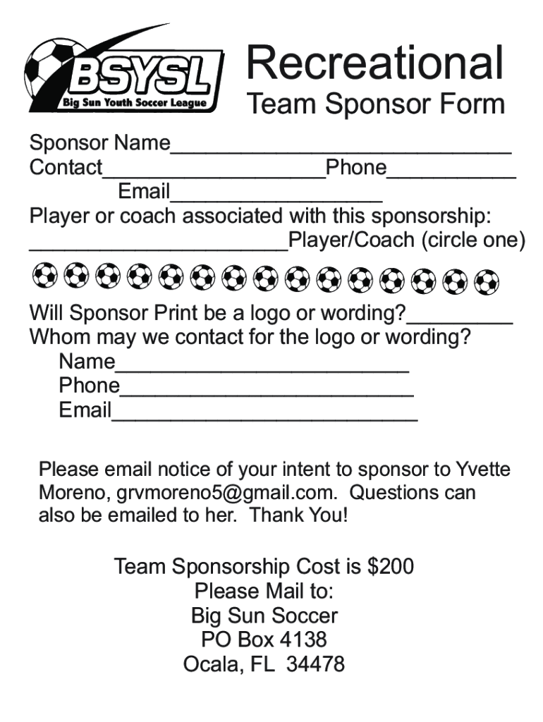 Recreational Team Sponsor Form Sponsor Name Contact Phone Email Player or coach associated with this sponsorship: Player/Coach (circle one) Will Sponsor Print be a logo or wording? Whom may we contact