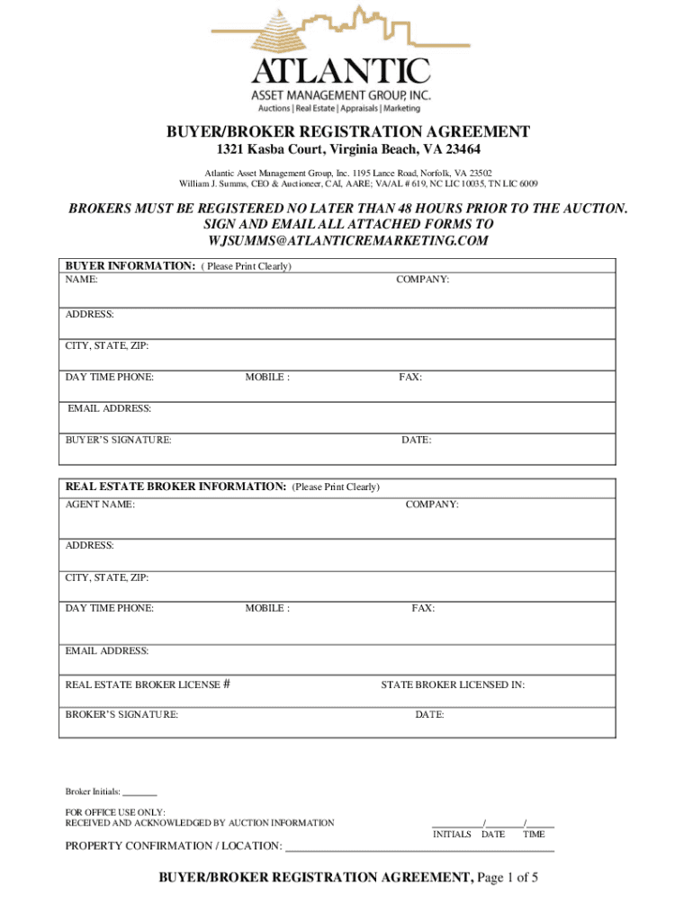 BUYER/BROKER REGISTRATION AGREEMENT 1321 Keisha Court, Virginia Beach, VA 23464 Atlantic Asset Management Group, Inc. 1195 Lance Road, Norfolk, VA 23502 William J. Sums, CEO & Auctioneer, CAI, ARE;