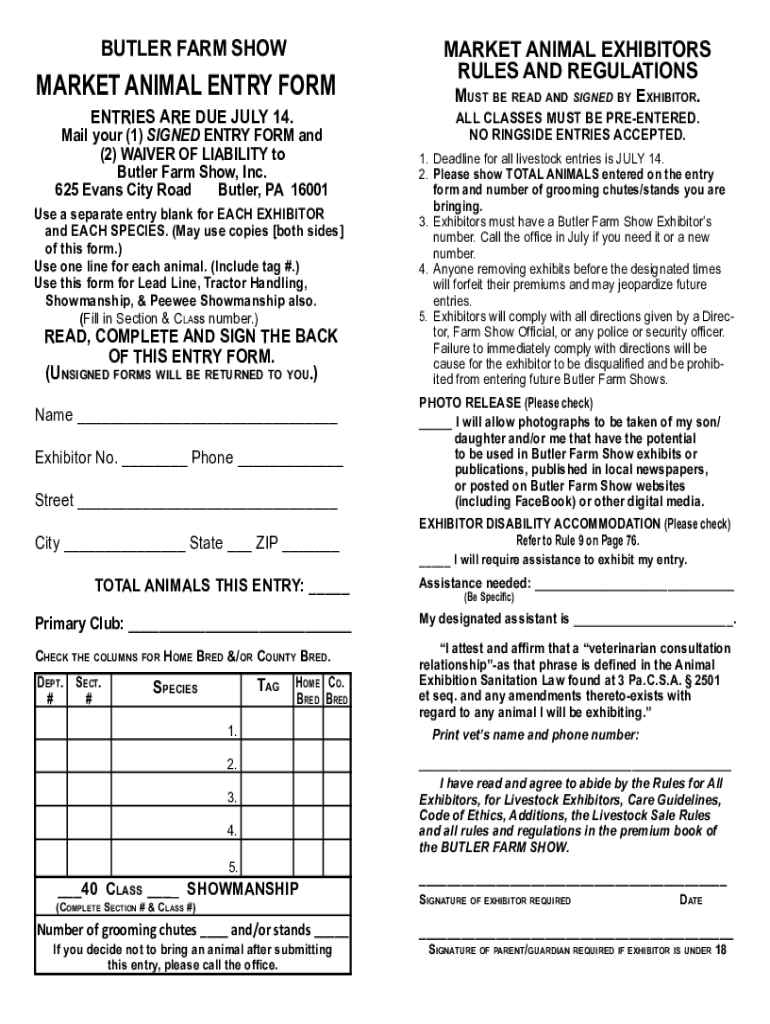 BUTLER FARM SHOEMAKER ANIMAL ENTRY FORM ENTRIES ARE DUE JULY 14. Mail your (1) SIGNED ENTRY FORM and (2) WAIVER OF LIABILITY to Butler Farm Show, Inc. 625 Evans City Road Butler, PA 16001 Use a separate