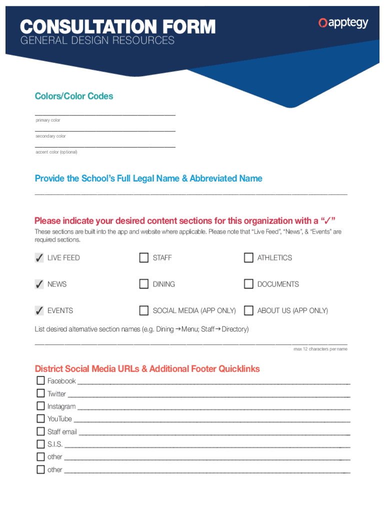 CONSULTATION FORM GENERAL DESIGN RESOURCESColors/Color Codes primary color secondary color accent color (optional)Provide the Schools Full Legal Name & Abbreviated Name Please indicate your desired