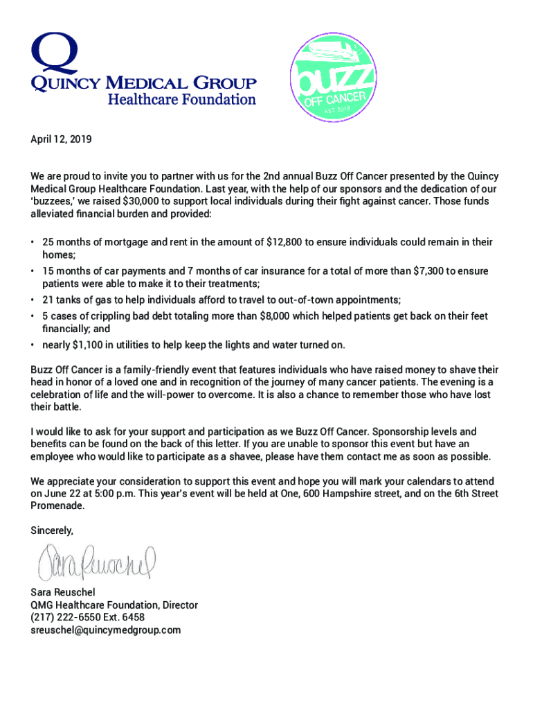 We are proud to invite you to partner with us for the 2nd annual Buzz Off Cancer presented by the Quincy
