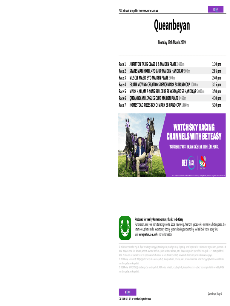 FREE printable form guides from www.punters.com.auQueanbeyan Monday 18th March 2019Race 1 Race 2 Race 3 Race 4 Race 5 Race 6 Race 7J BRITTON TAXIS CLASS 1 & MAIDEN PLATE 1600 m STATESMAN HOTEL 4YO