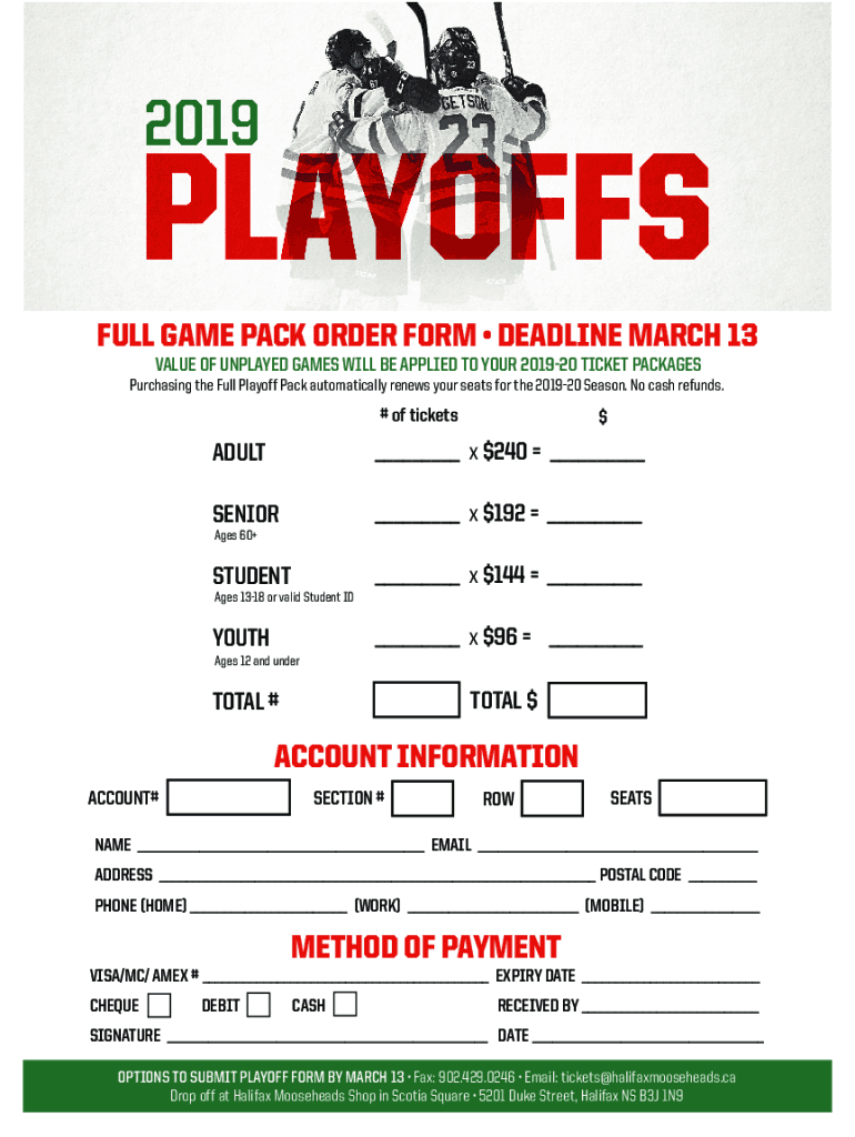FULL GAME PACK ORDER FORM DEADLINE MARCH 13 VALUE OF UNPLACED GAMES WILL BE APPLIED TO YOUR 201920 TICKET PACKAGES Purchasing the Full Playoff Pack automatically renews your seats for the 201920 Season.