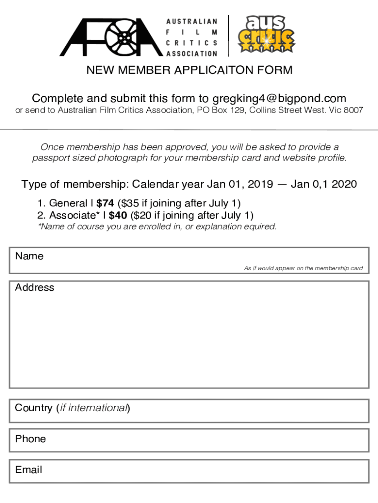 NEW MEMBER APPLICATION FORM Complete and submit this form to gregking4 bigpond.com or send to Australian Film Critics Association, PO Box 129, Collins Street West. Vic 8007Once membership has been