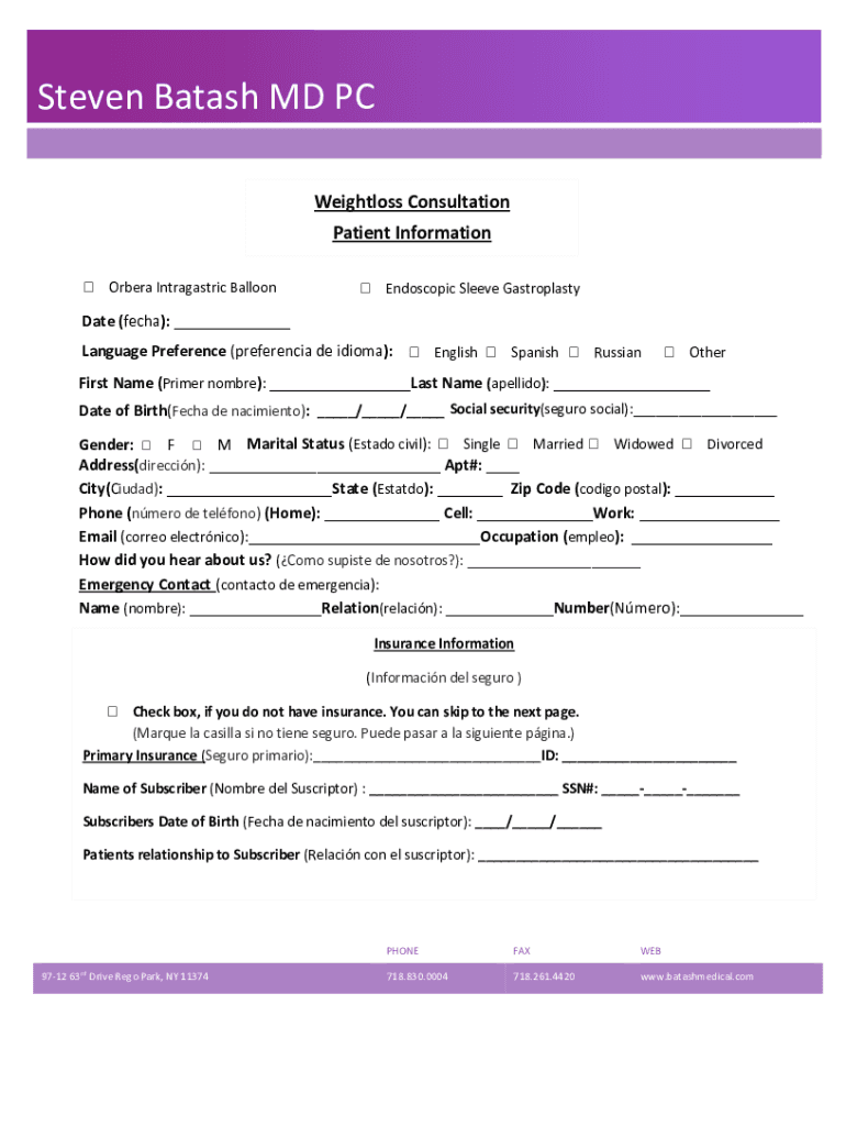 Steven Bat ash MD PC Weightless Consultation Patient Information Orb era Intragastric Balloon systemEndoscopic Sleeve GastroplastyDate (tech): Language Preference (preference DE idiom): English Spanish