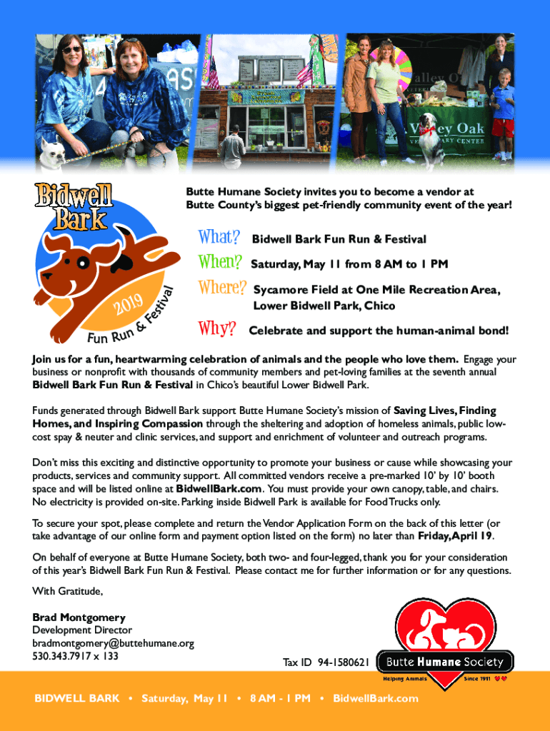 Butte Humane Society invites you to become a vendor at Butte Counties the biggest pet friendly community event of the year! What? Bi dwell Bark Fun Run & Festival When? Saturday, May 11 from 8 AM
