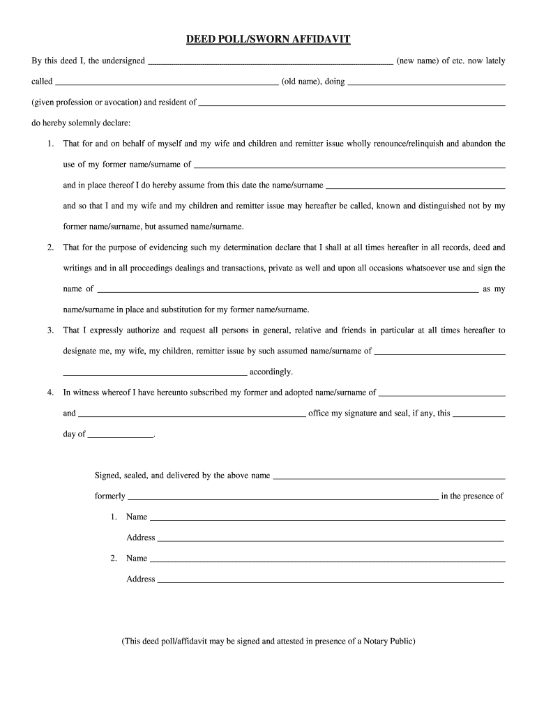 DEED POLL/AFFIDAVIT By this deed I, the undersigned (new name) of etc. now lately called (old name), doing (given profession or avocation) and resident of do hereby solemnly declare: 1. That for and