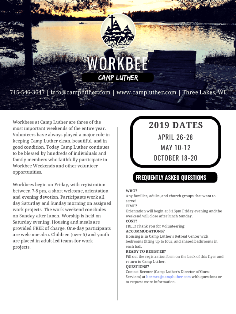 WORK BEE Camp Luther7155463647 info campluther.com www.campluther.com Three Lakes, WIWorkbees at Camp Luther are three of the most important weekends of the entire year. Volunteers have always played