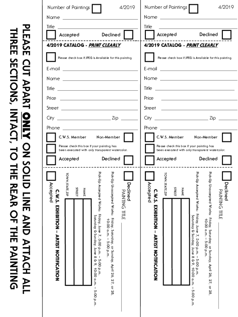 4/2019 Name Number of Paintings4/2019Title AcceeeAcceptedNumber of PaintingsTitle Accepted Declined4/2019 CATALOG PRINT CLEARLYDeclined4/2019 CATALOG PRINT CLEARLYPlease check box if JPEG is Available